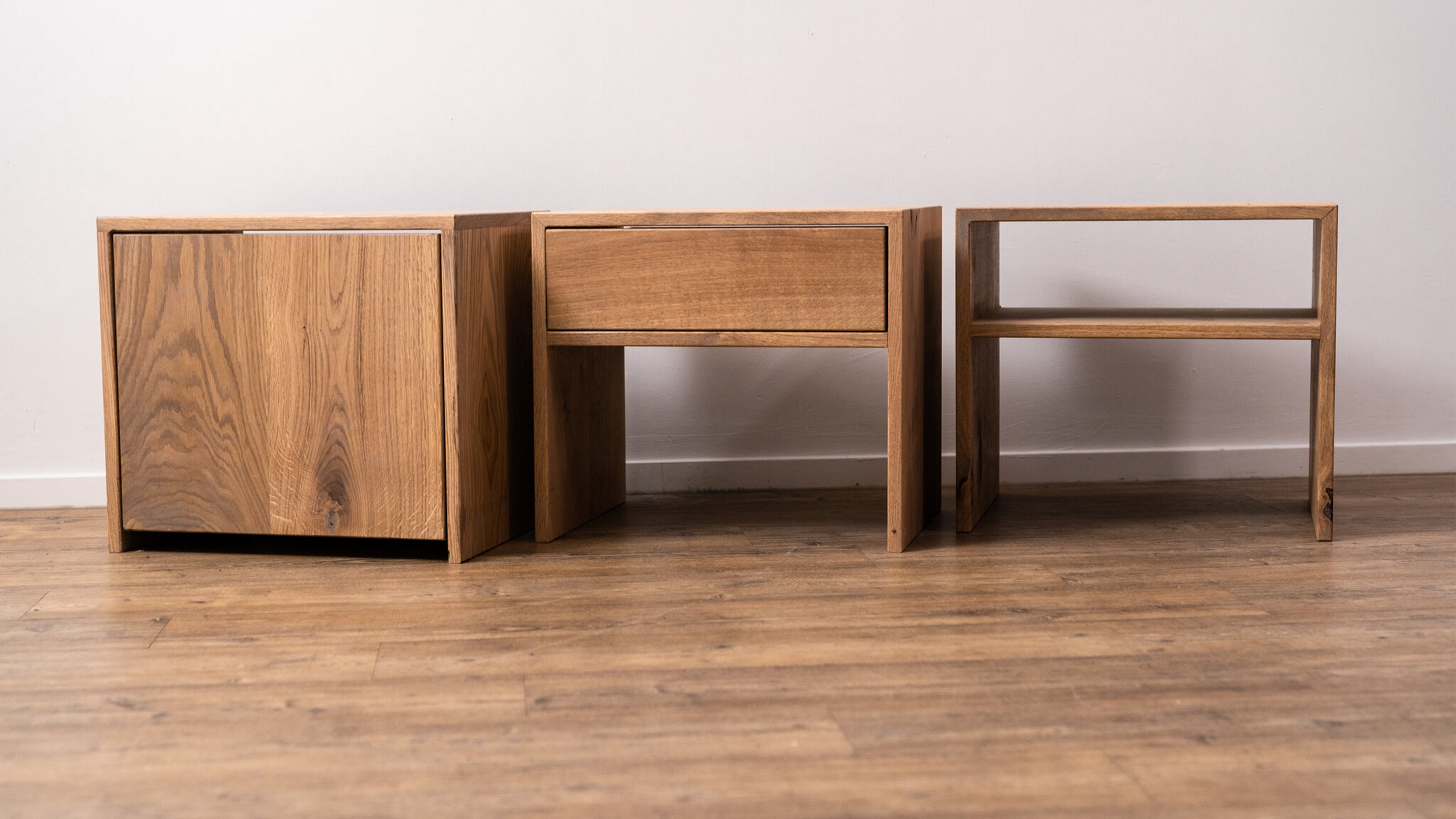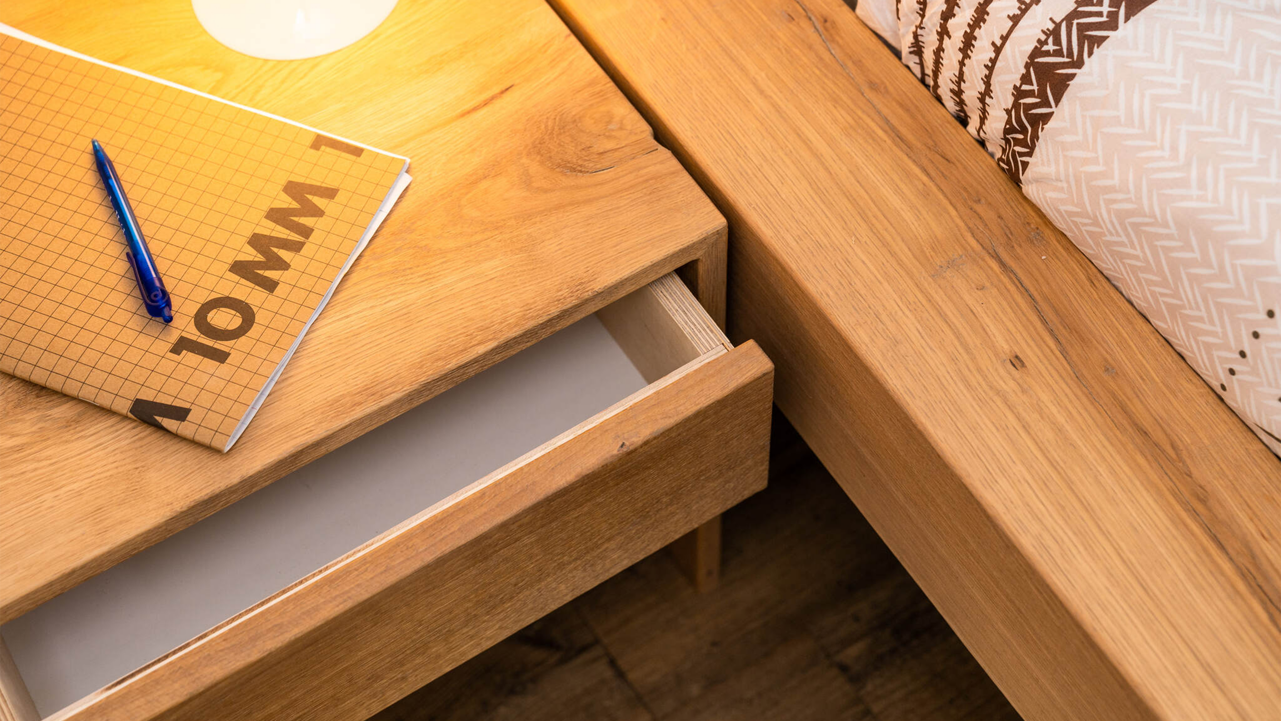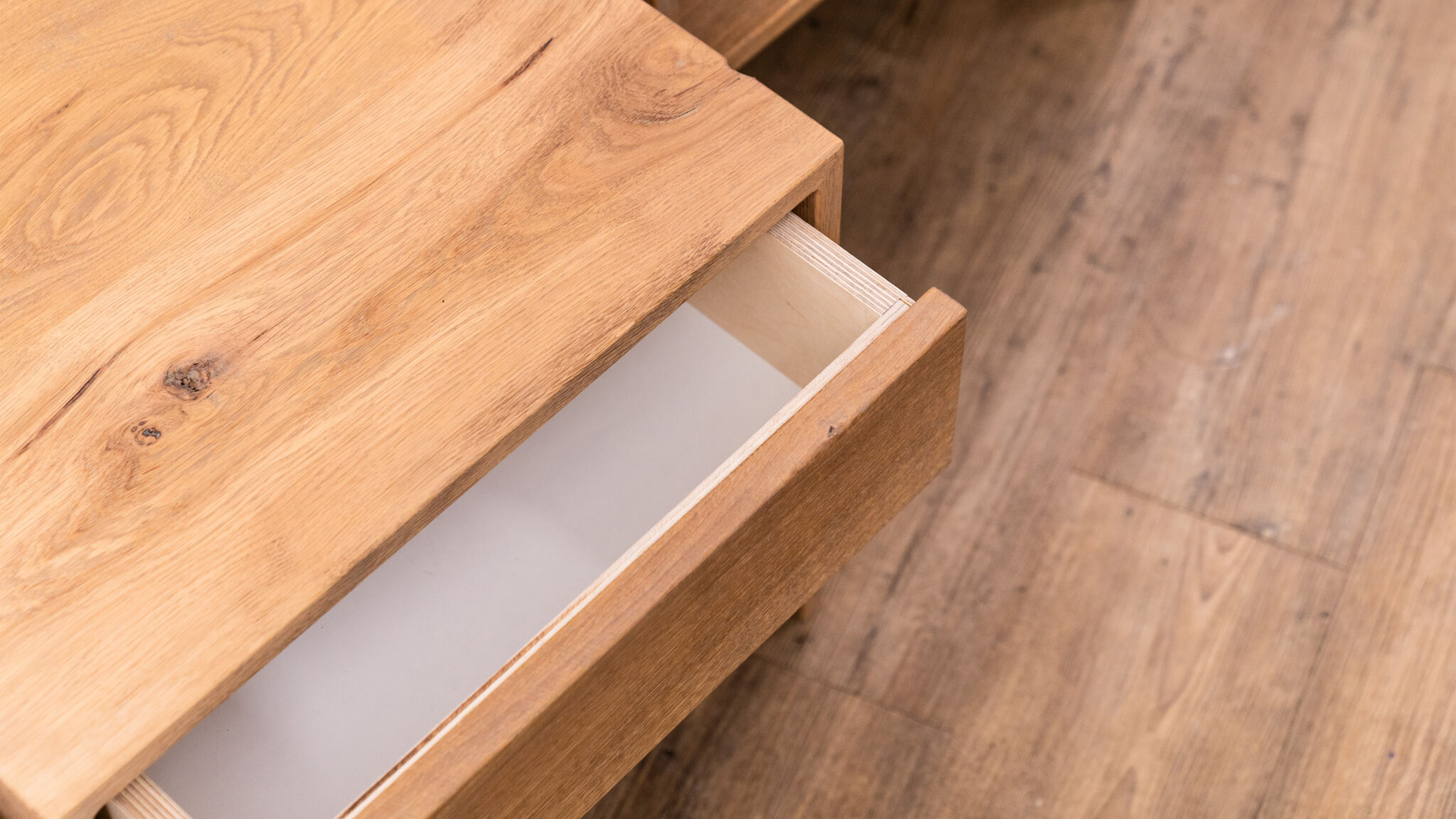 Dit eiken houten nachtkastje heeft een lade. Dit geeft een moderne uitstraling geeft en kan gebruikt worden om gemakkelijk spullen op te bergen.