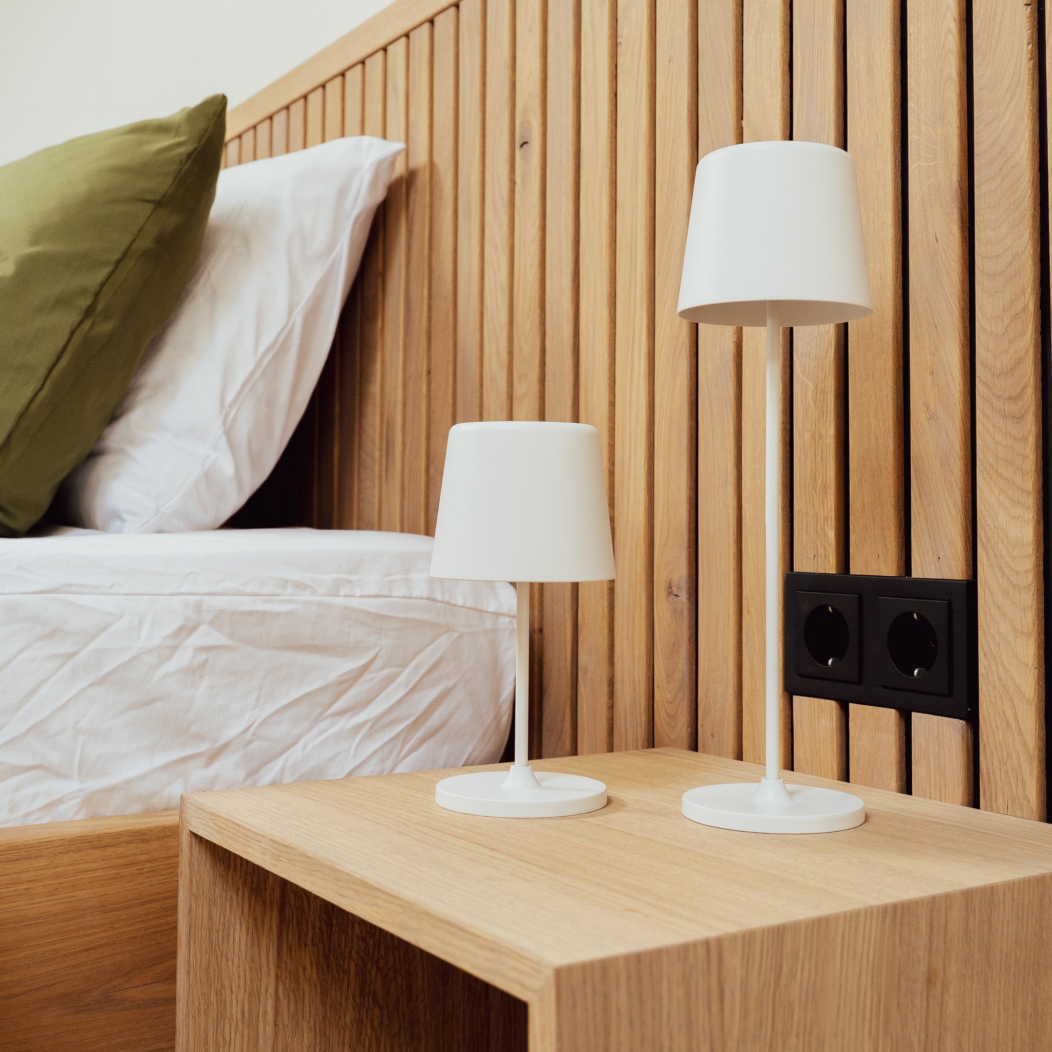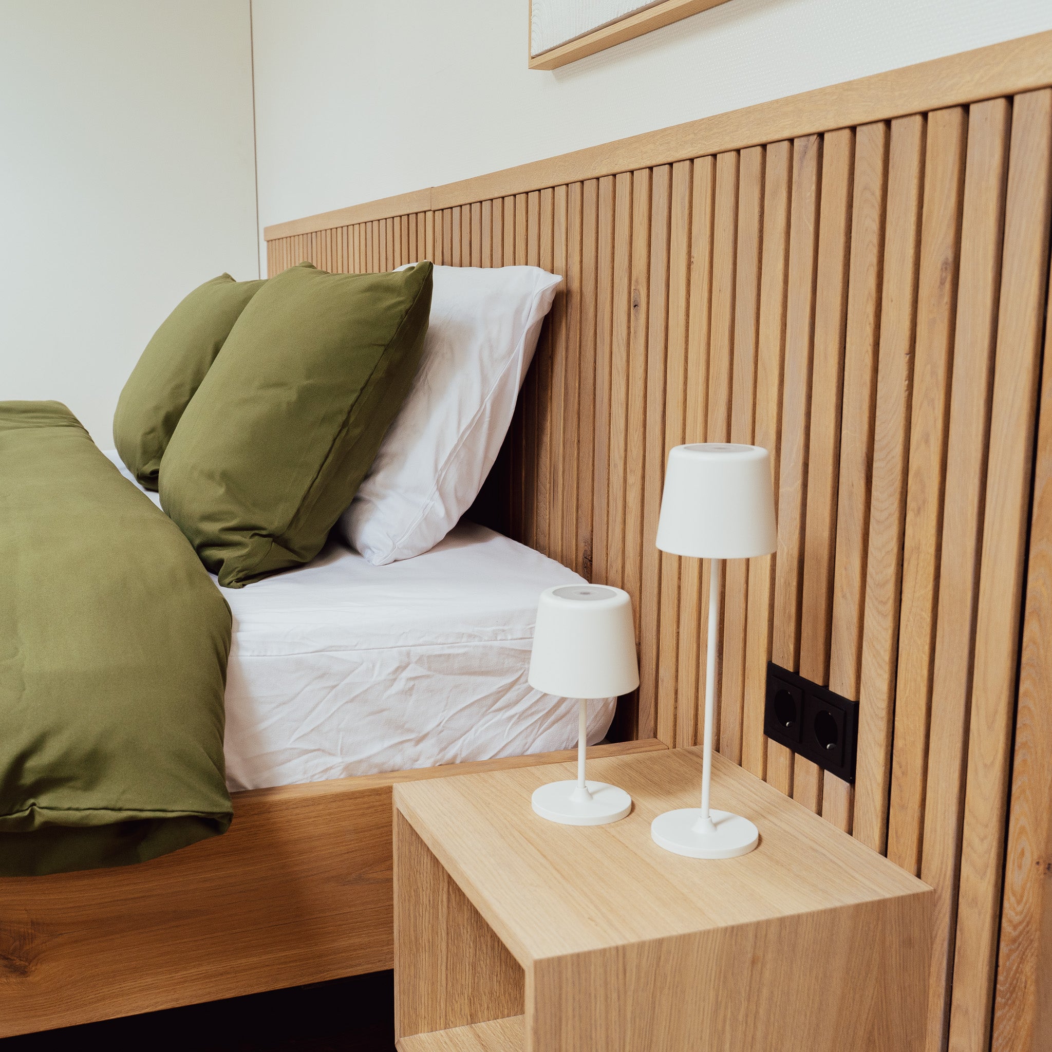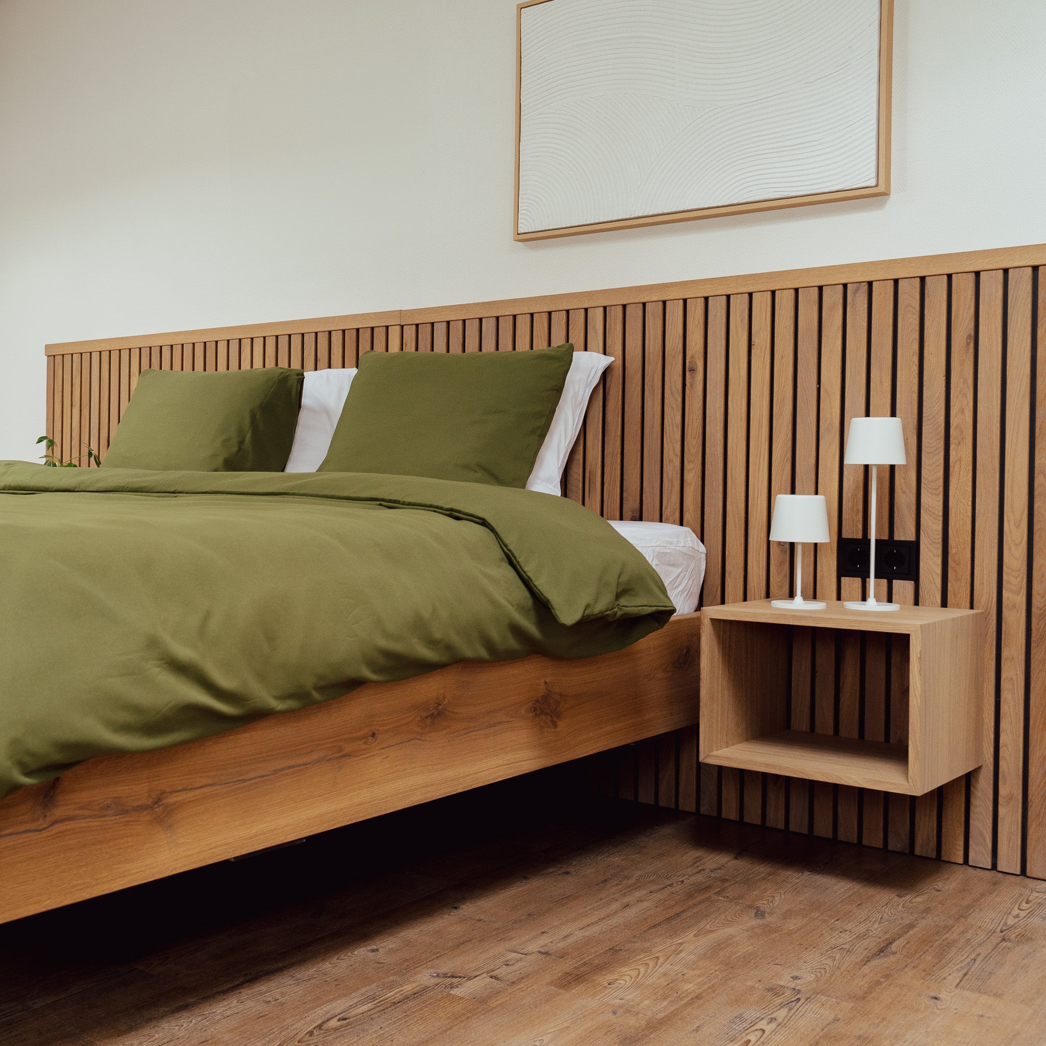 Het bed Oak & Black is een bed met een zwevende uitstraling. Dit bed wordt gemaakt doormiddel van een "latten-wand" hierbij worden de massief eiken latten op een zwarte plaat gemonteerd.